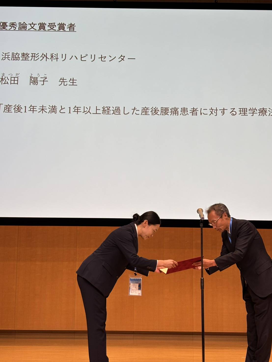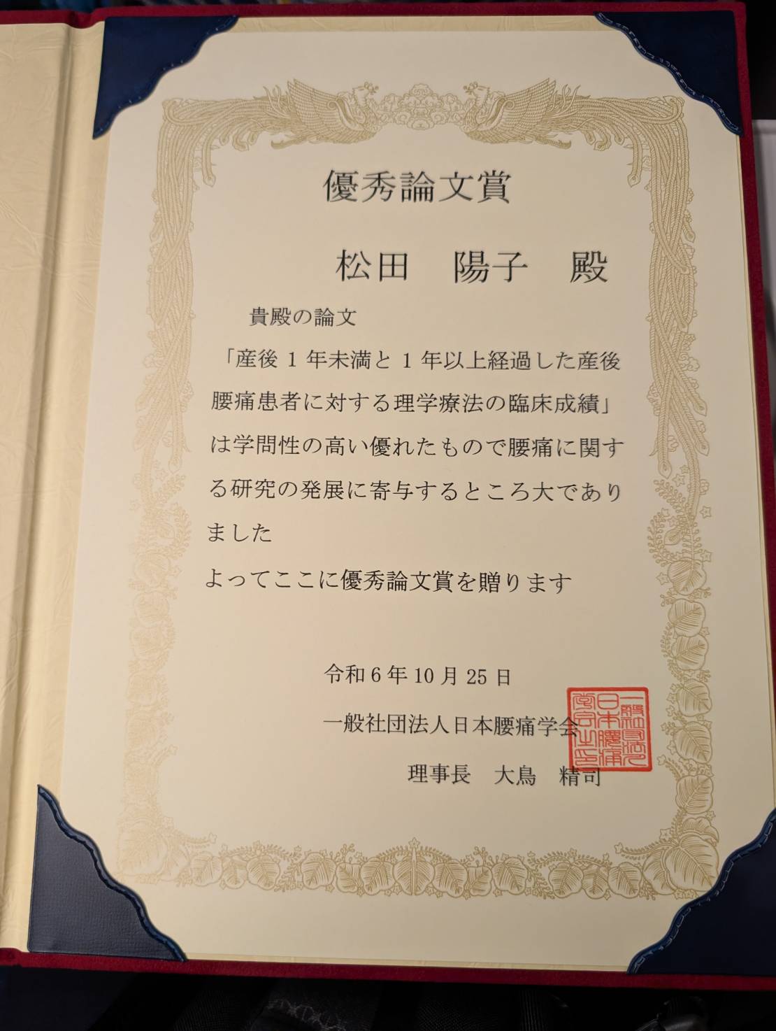 当ゼミ大学院博士後期課程修了の 松田 陽子 さん(医療法人社団おると会浜脇整形外科リハビリセンター)の投稿論文(共著)が,2025年10月25日に(一社)日本腰痛学会 優秀論文賞 を受賞しました.本研究は博士課程で行われた研究成果の一部です.